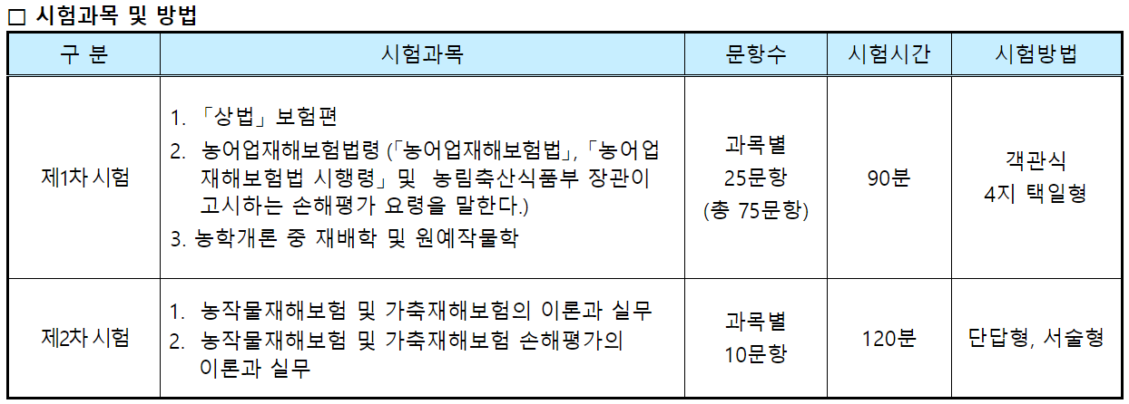1. 시험 과목: 상법, 농어업재해보험법, 재해 분석 등