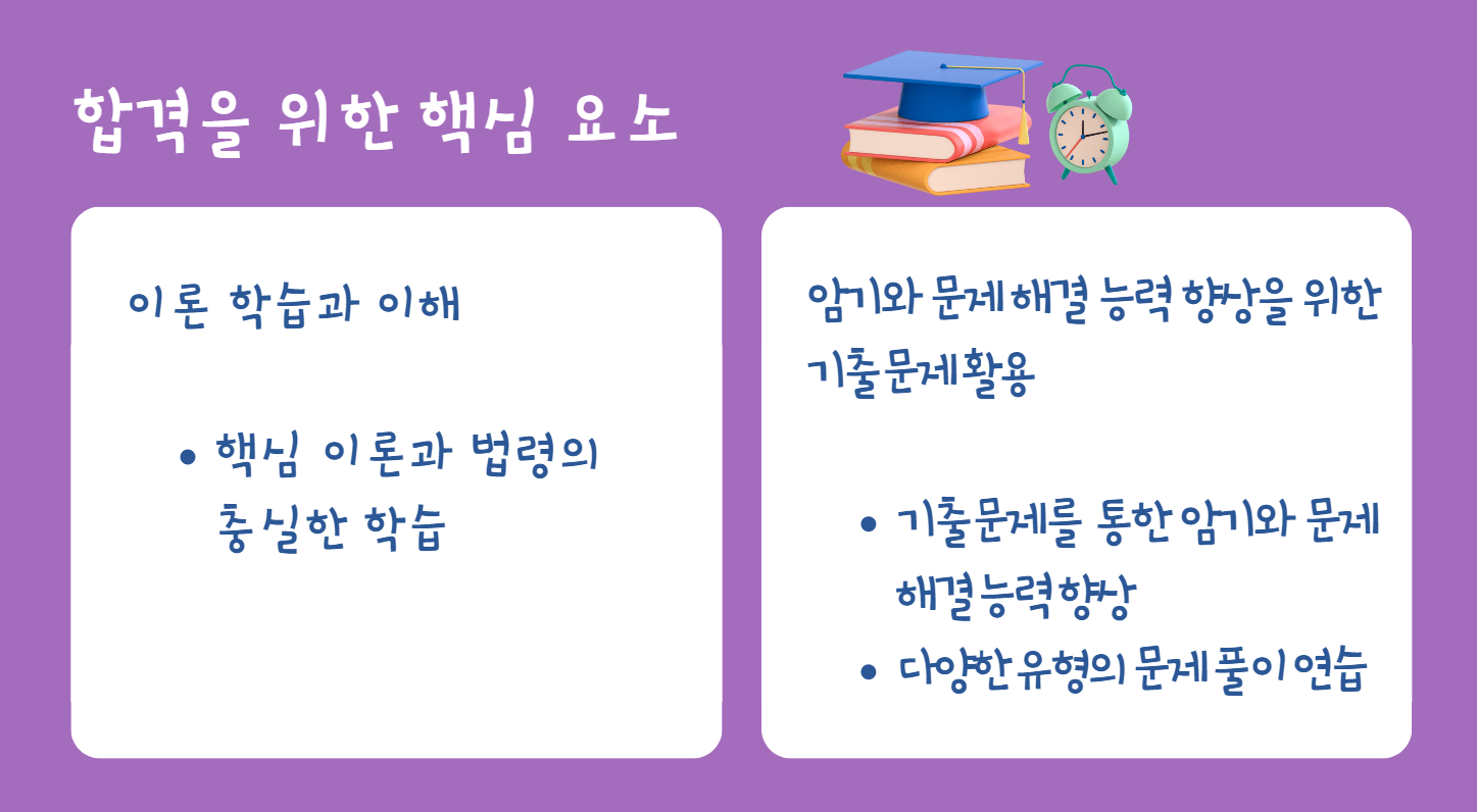 합격을 위해서는 이론을 확실하게 이해하고 암기하며, 기출문제를 통해 문제 해결 능력을 향상시키는 것이 중요합니다.