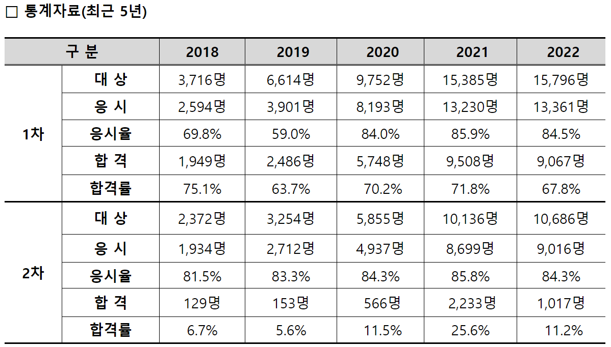 2차 시험은 일차에 비해 난이도가 높으며, 합격률은 최소 5%대부터 20%대까지 변동됩니다. 최근 3년간의 합격률은 2020년에는 일차 70.2%, 이차 11.5%, 2021년에는 일차 71.8%, 이차 25.6%, 2022년에는 일차 67.8%, 이차 11.2%로 나타났습니다.